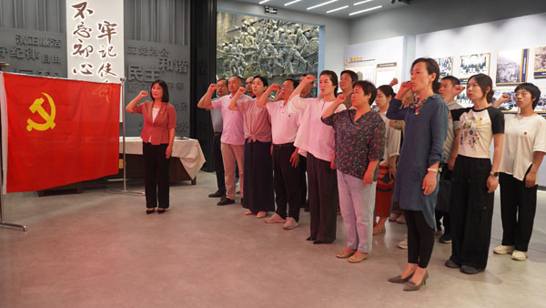 參館結(jié)束后,新鄉(xiāng)市職業(yè)病防治研究所參訪人員在黨旗下莊嚴(yán)宣誓,重溫入黨誓詞。